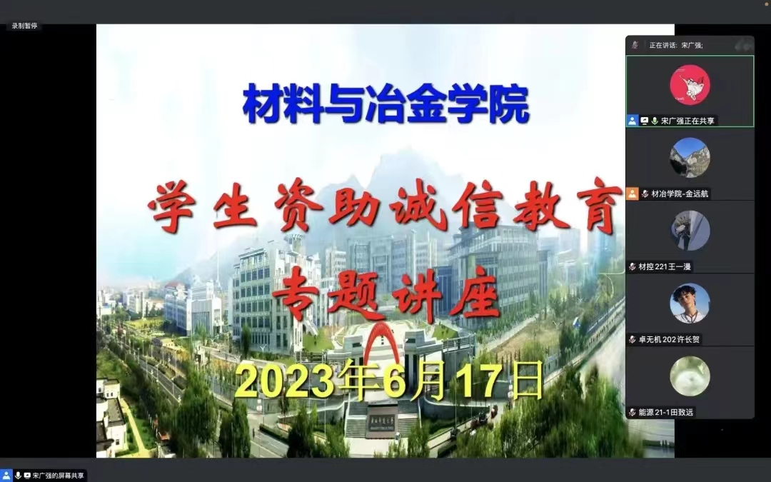 617日晚,材料与冶金学院举办学生资助诚信教育专题讲座,材料与冶金学院全体本科生收听讲座,讲座由学院辅导员宋广强副教授主讲。