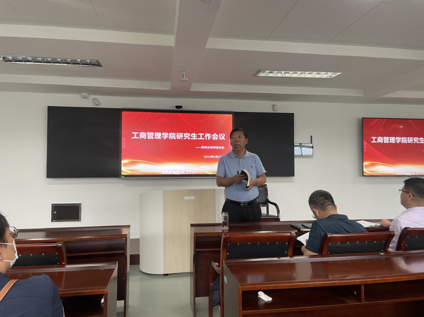 工商管理学院副院长宋伟对本学期研究生任课老师关于学术型硕士和MBA教育中心教学相关情况进行相关规划部署,在会议上提出了三点要求:一是老师要切实提高课堂质量,做好考勤工作,要切实履行导师的责任和义务。做好研究生的教学建设。二是组织完成研究生与导师指导关系确立工作,各导师加强日常指导,严格把关,提高学位论文质量。重点强调做好本年度论文抽检部署工作。三是大力开展导师培训,研讨研究生院发布的十二个管理文件,会上就管理文件与各任课老师交流意见。