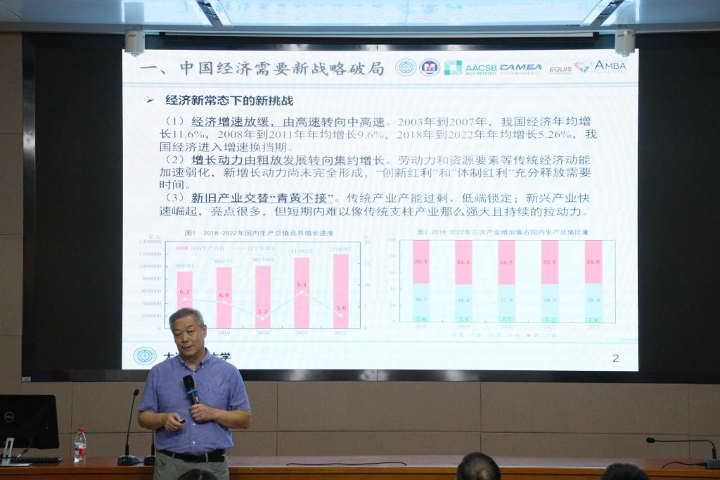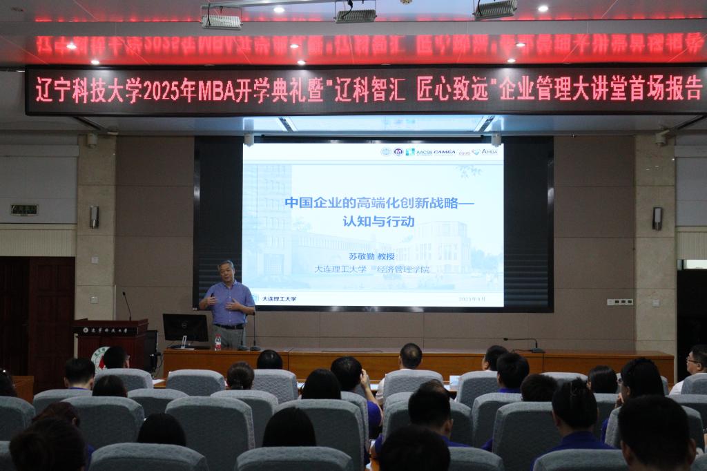 2025年8月30日,火博手机版登录入口工商管理学院迎来了一场思想盛宴——MBA2025级开学典礼暨“辽科智汇·匠心致远”企业管理大讲堂正式启动。首场报告特邀国家级领军人才、大连理工大学苏敬勤教授作题为《中国企业的高端化战略—从认知到行动》的专题演讲。讲座由工商管理学院院长金玉然教授主持,2025级全体MBA学员及部分教师参与本次论坛。