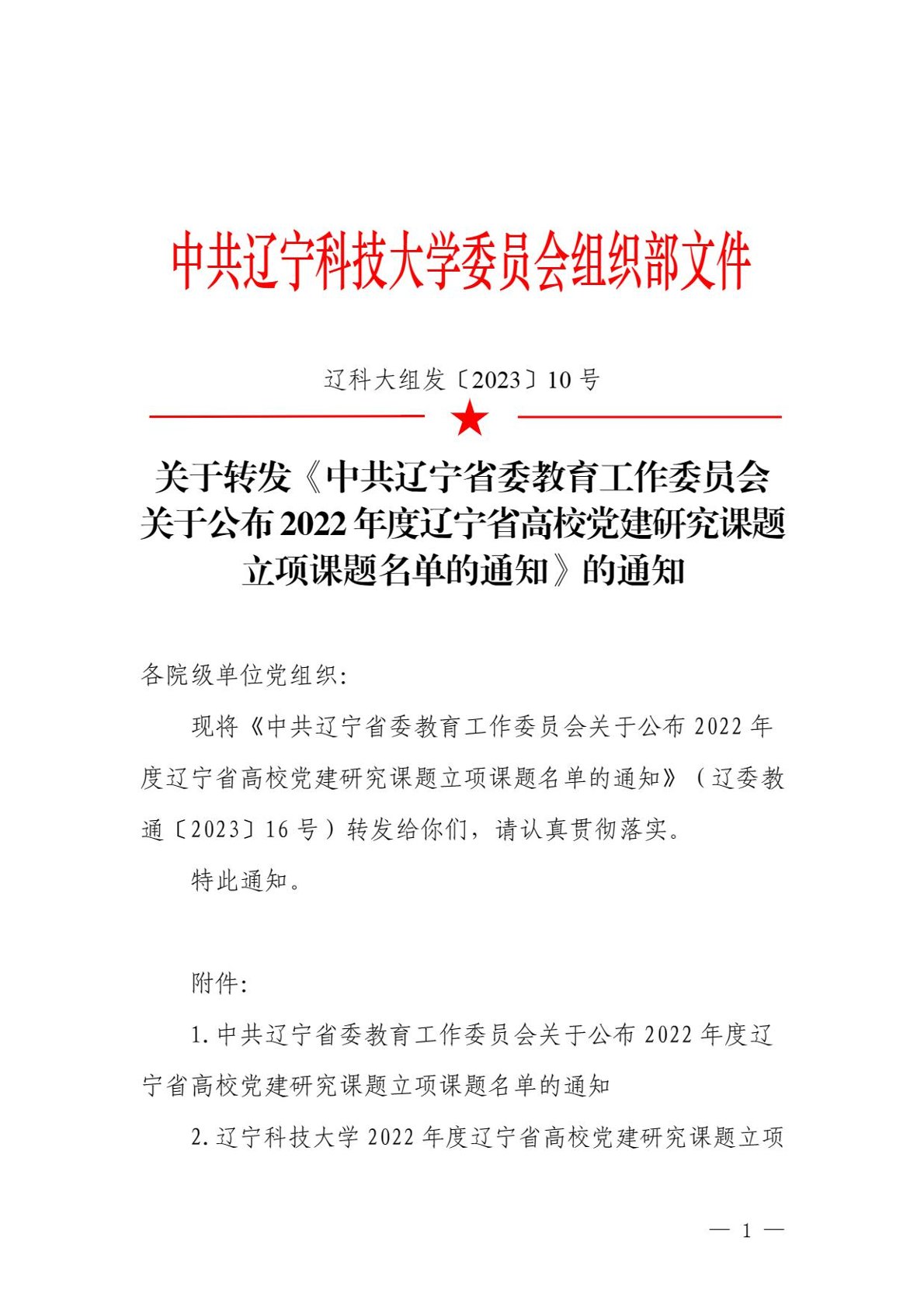 关于转发《中共辽宁省委教育工作委员会关于公布2022年度辽宁省高校党建研究课题立项课题名单的通知》的通知