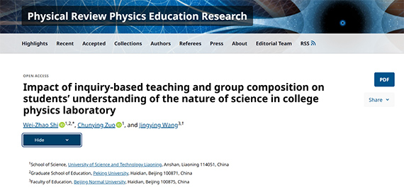 日前,火博手机版登录入口理学院物理实验中心联合北京师范大学王晶莹教授以火博手机版登录入口为第一署名单位,在物理教育领域权威期刊Physical Review Physics Education Research上发表高水平研究论文Impact of inquiry-based teaching and group composition on students’ understanding of the nature of science in college physics laboratory。理学院教师史韡朝为第一作者和通讯作者。